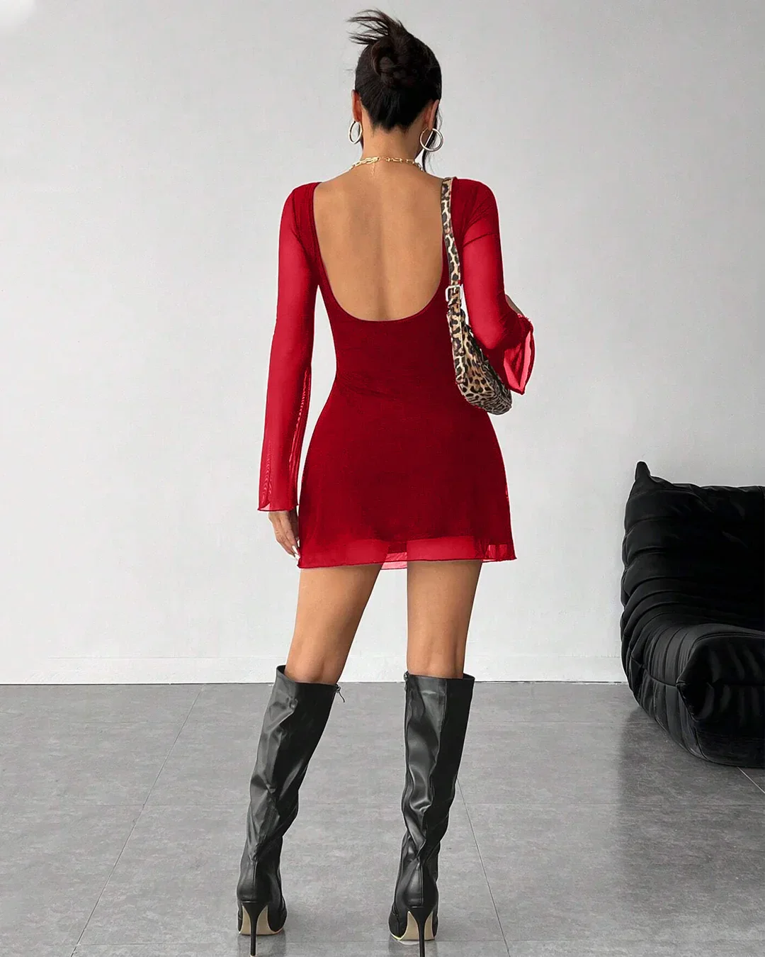 Backless Mesh Trumpet Sleeve Bodycon Mini Dress in Red