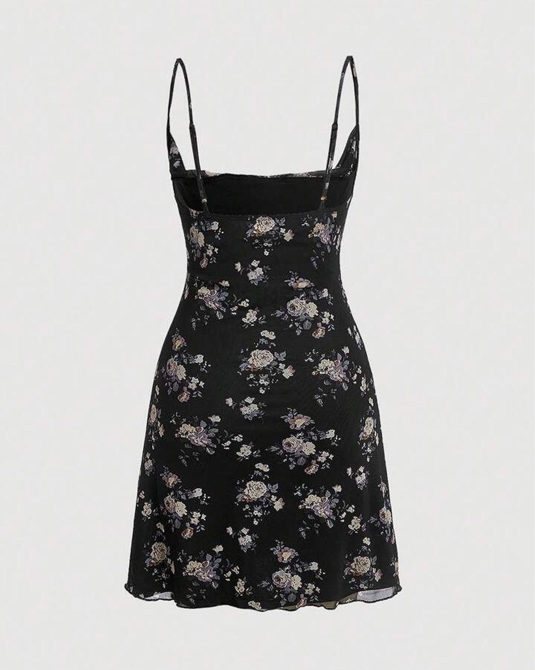 Floral Print Cami Black Swing Collar Mesh Print Dress
