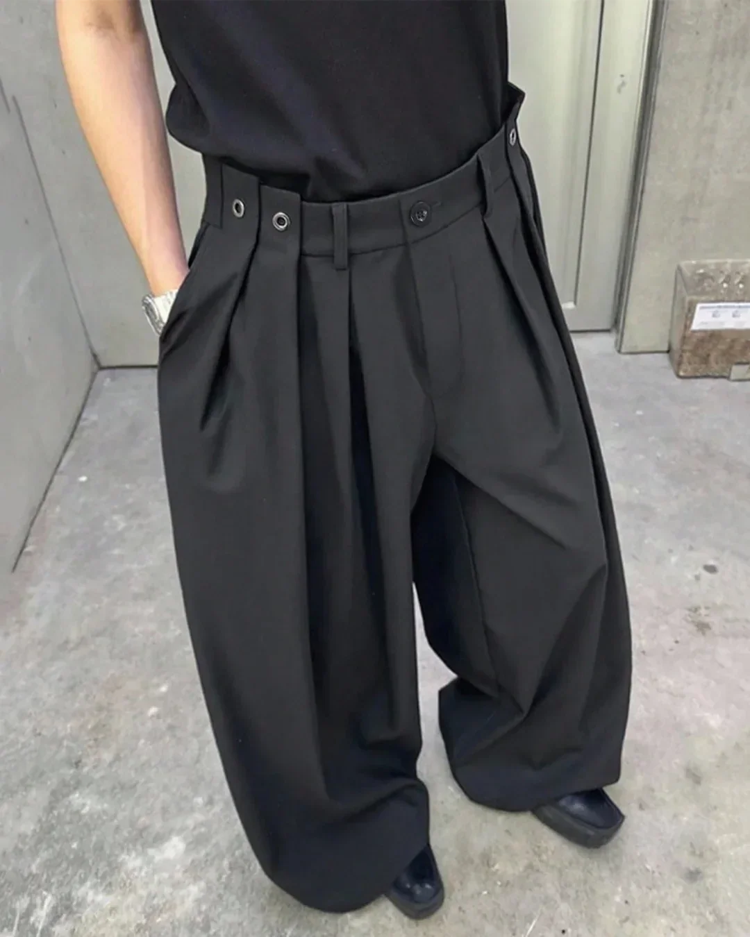 Men High-Waisted Pleated Wide-Leg Loose Casual Trousers in Black