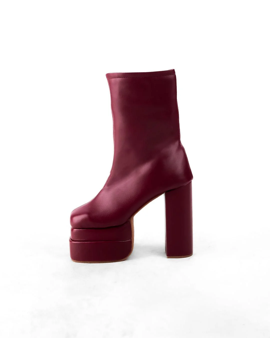 Platform Ankle Length Boots with High Block Heel in Cherry Red