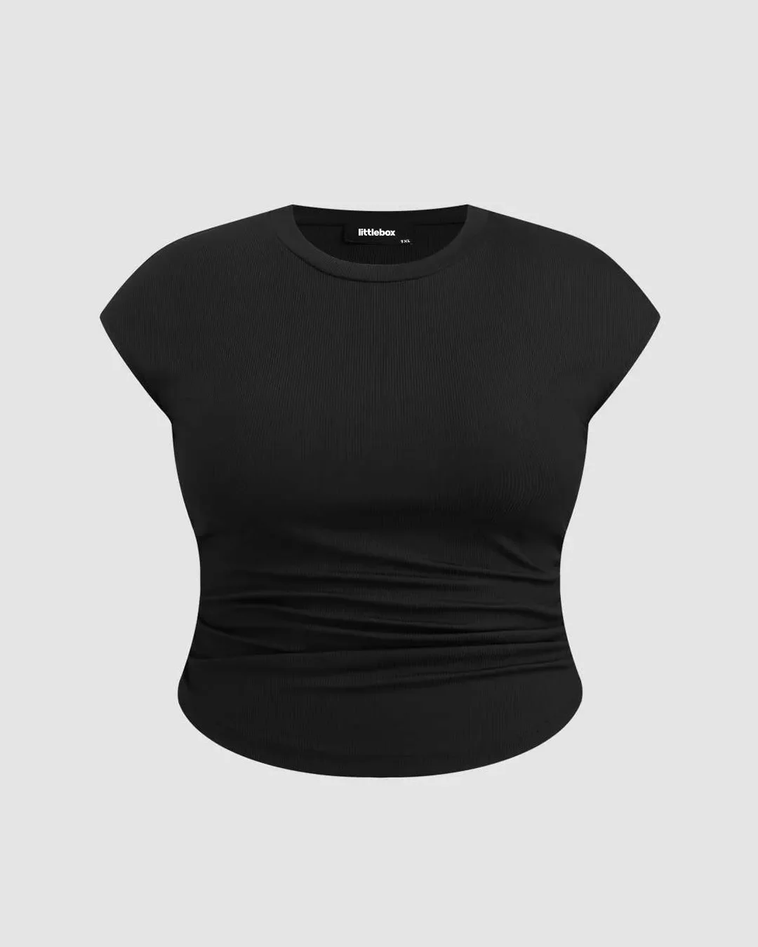 Meet your new base for easy outfits. This ribbed short sleeve top has a clean round neck and gentle side ruching that flatters without feeling tight. Soft stretch fabric moves with you and sits smooth under layers. If you love plus size black tops that work with everything, this one lands the perfect balance of comfy and polished.