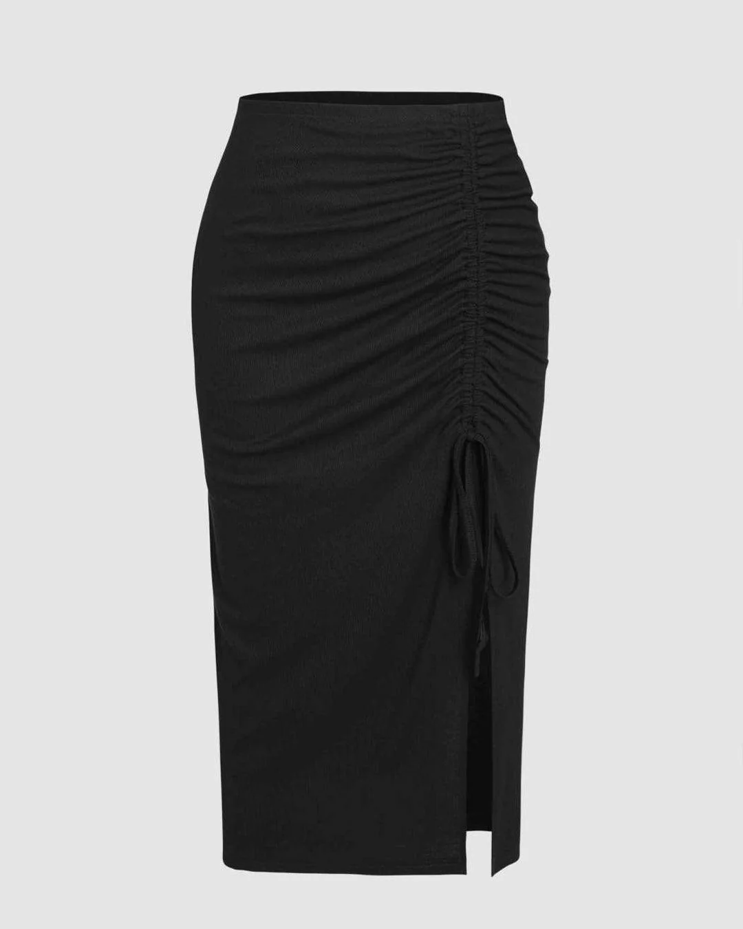 Upgrade your wardrobe with the Solid Drawstring Split Maxi in Black. Designed specially for plus-curve queens, this skirt has a stylish ruched drawstring in the front and a side slit that adds a trendy touch.