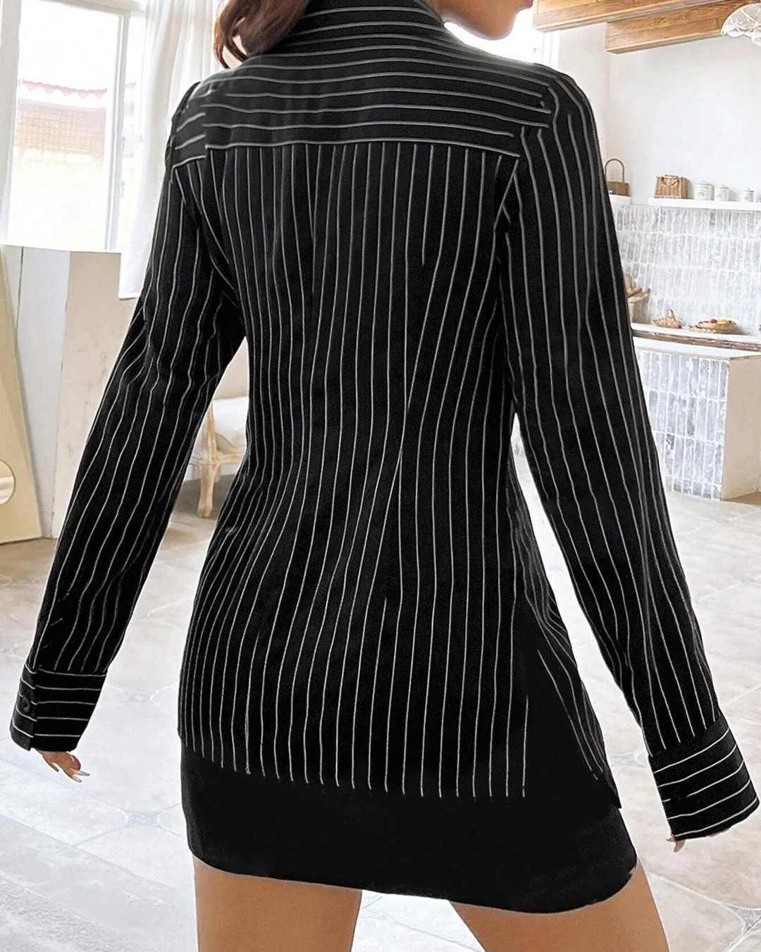 This black full sleeve shirt brings a sharp, confident vibe with its clean tailoring and striped pattern. Designed with a collared neckline and button-front closure, it creates a structured silhouette that feels polished and modern. The vertical stripes add a flattering touch, while the fitted shape keeps the look sleek without feeling stiff. This black full sleeve shirt feels bold, versatile, and easy to style.